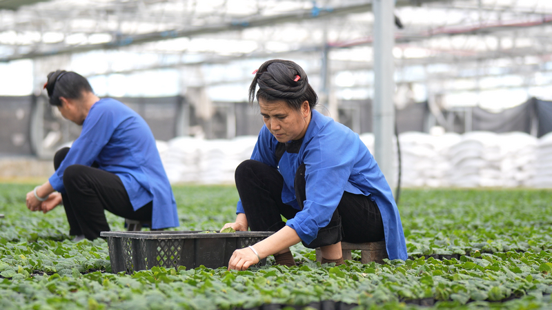 工人在位于榕江县的贵州省甜甜榕江农业贸易有限公司育苗大棚进行罗汉果苗管护工作。贵阳银行为该企业提供了500万元专项资金。