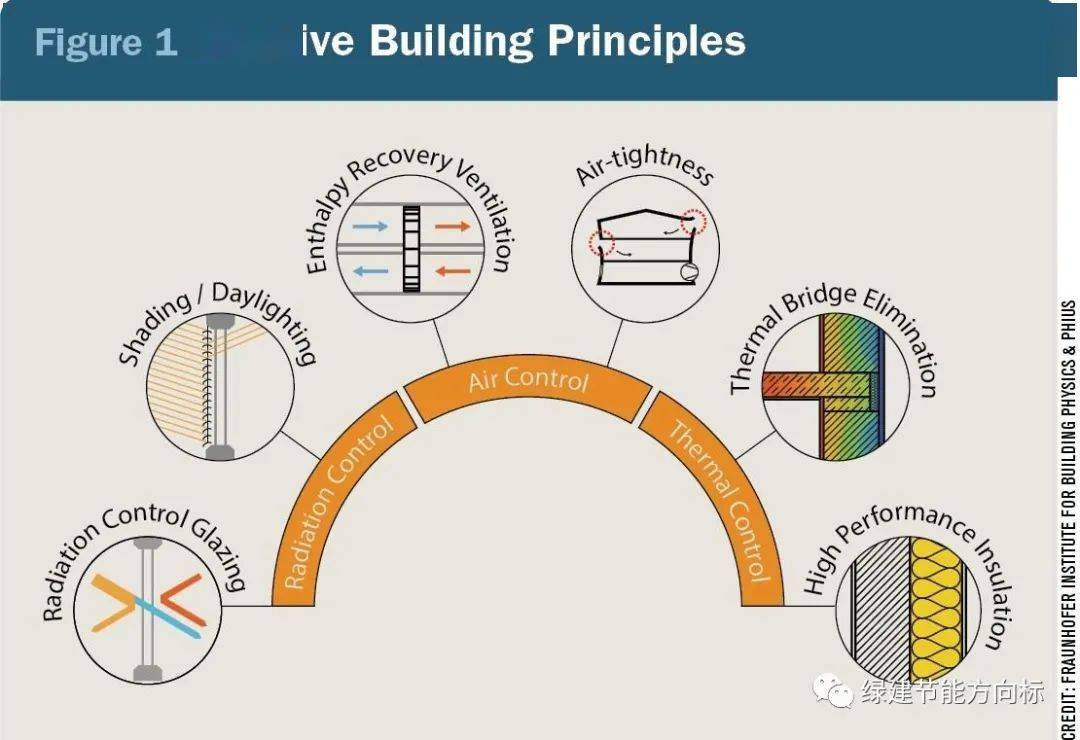 这些构成了主要的被动式建筑原则:(1) 高性能保温,(2) 消除热桥,(3) 最佳玻璃窗,(4) 遮阳/采光,(5) 气密性,以及 (6) 能量回收通风(下图)。